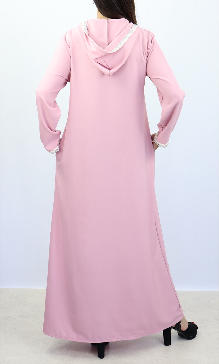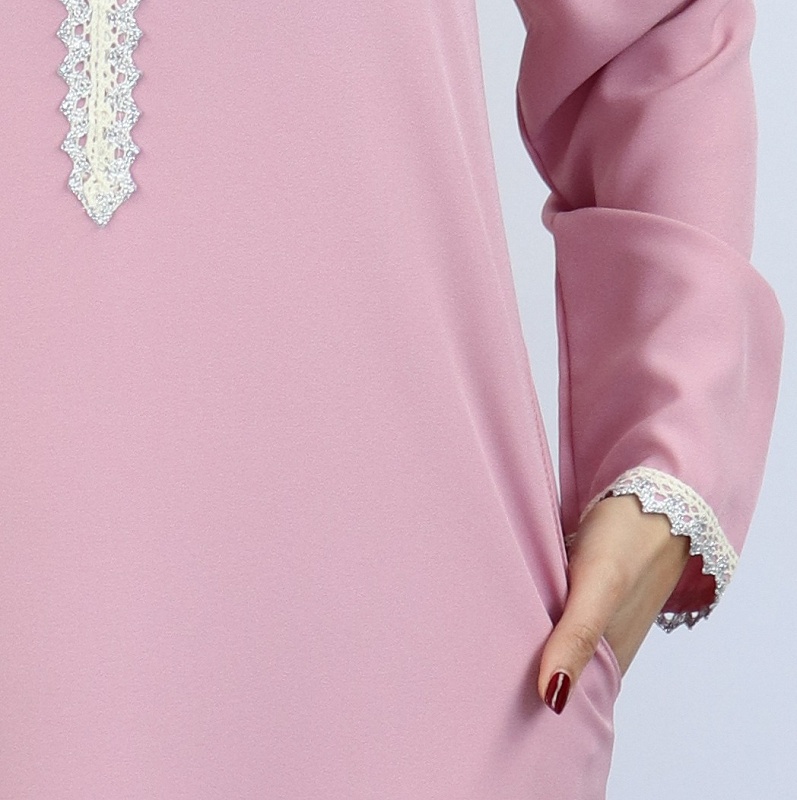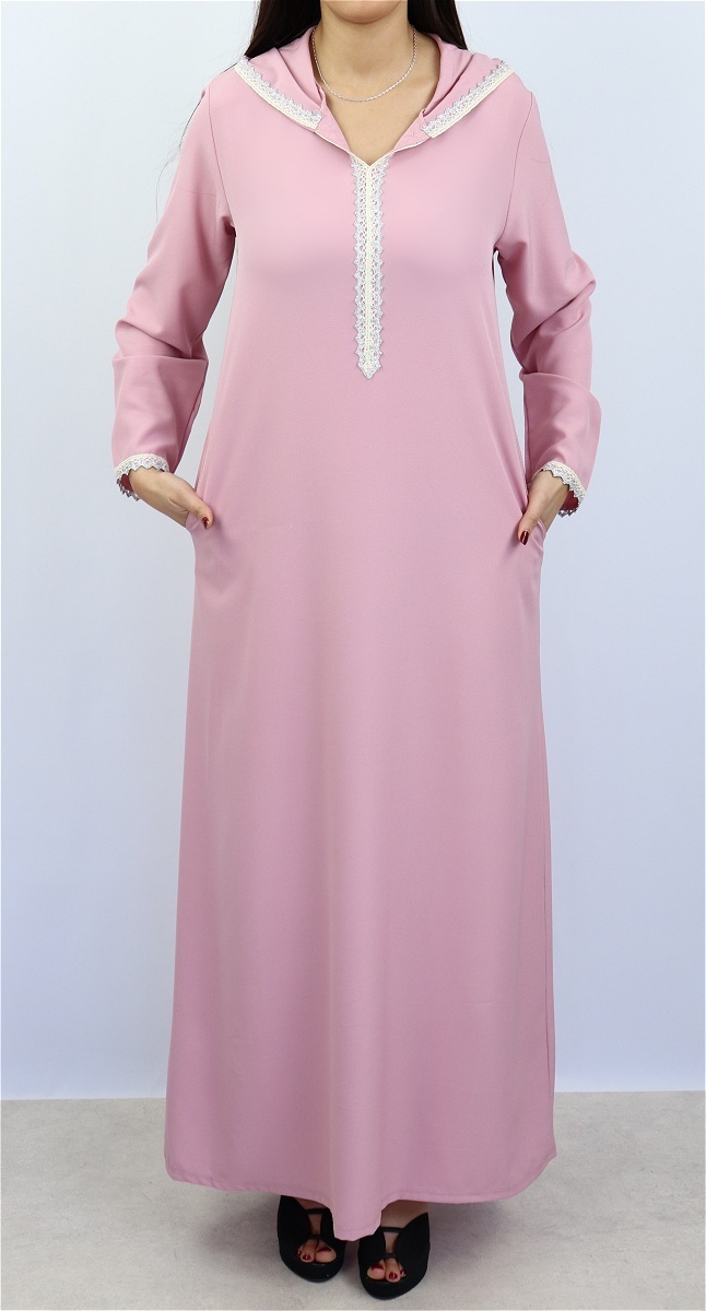 Djellaba marocaine avec dentelles dorées sur le devant, sur les poignets ainsi que le contour de la capuche, 2 poches latérales pratiques pour ranger vos effets personnels.