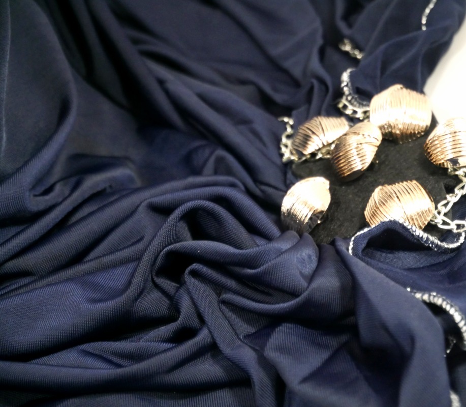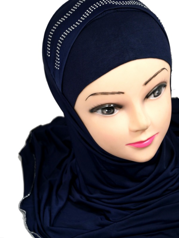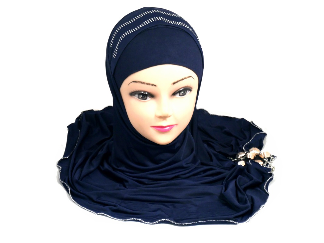 Hijab 1 pièce bleu pailleté décoré de strass motifs ondulés avec une décoration en argent accompagnée de fines chaines. Contour cousu fil argenté.