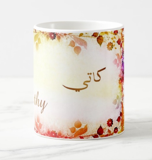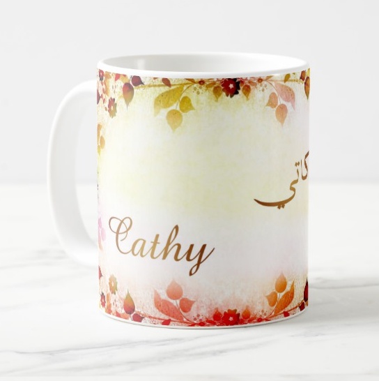 Mug avec le prénom Cathy calligraphié en arabe ainsi que son écriture normale en arabe (كاتي) et en français.