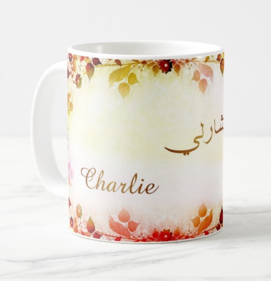 Mug avec le prénom Charlie calligraphié en arabe ainsi que son écriture normale en arabe (شارلي) et en français.