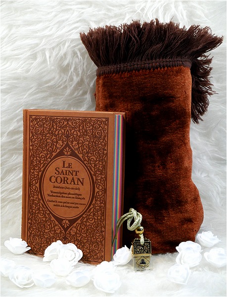 Coffret/Pack Cadeau Marron : Le Saint Coran Rainbow (francais-arabe-phonetique), Tapis de priere et Diffuseur de parfum