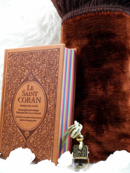 Pack cadeau avec livres : Le Saint Coran & La Citadelle du musulman (bilingues français/arabe) - Tapis marron - Chapelet - Parfum au choix - Tous de couleur noir - REF. 22303 (29.90 €)