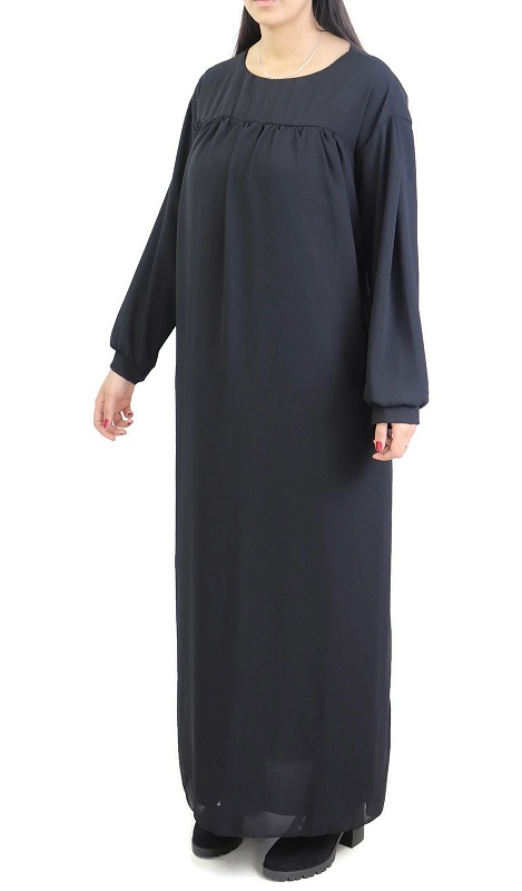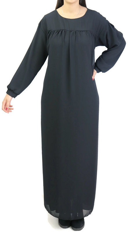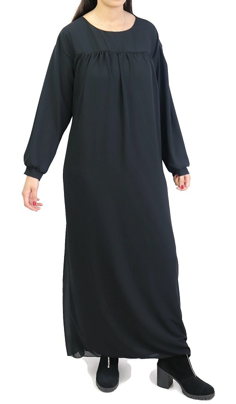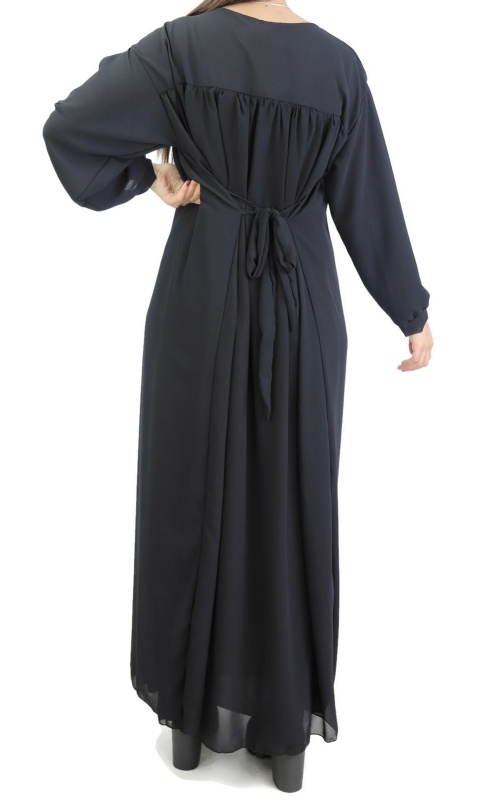 Coup de cœur pour cette robe longue et ample, entièrement doublée. Un vêtement simple qui peut se porter pour différentes occasions : au quotidien, mais aussi en soirée quand il est bien accessoirisé. Le haut est juste au corps, la taille est ample avec possibilité de la cintrer au moyen de la ceinture assortie fournie. Tissu de type crêpe. Ses manches sont longues et son col rond. On peut utiliser la ceinture par derrière ou ne pas la mettre.