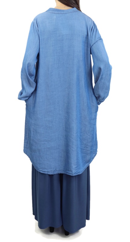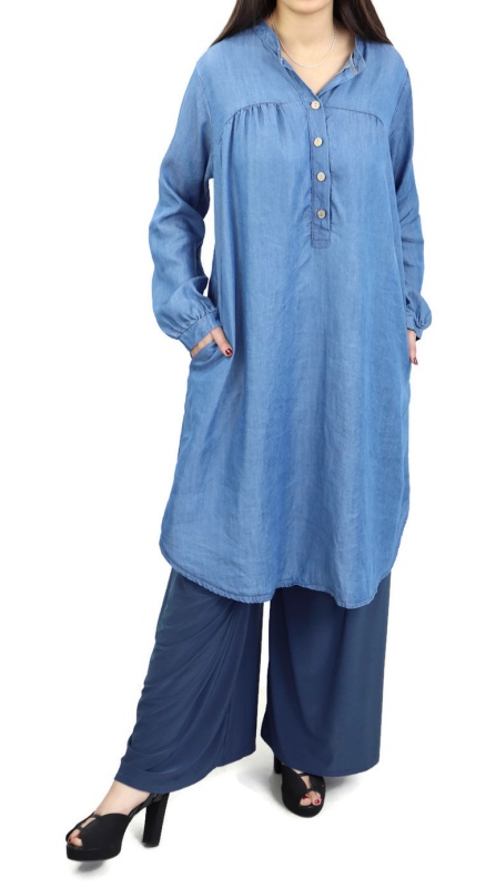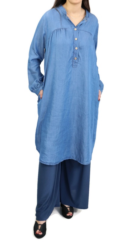 Adoptez cette tunique en jean très chic et très facile à enfiler grâce aux boutons sur la partie haute du vêtement. Sa coupe large vous assure la pudicité, ses poches vous permettent de garder vos effets, alors que sa matière en jean vous assure un style tout en modernité.