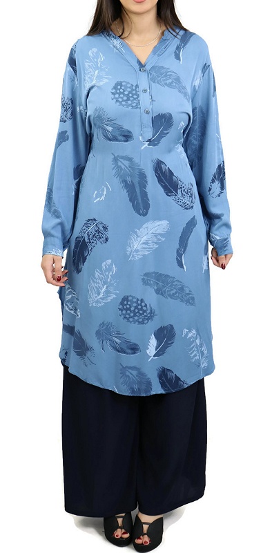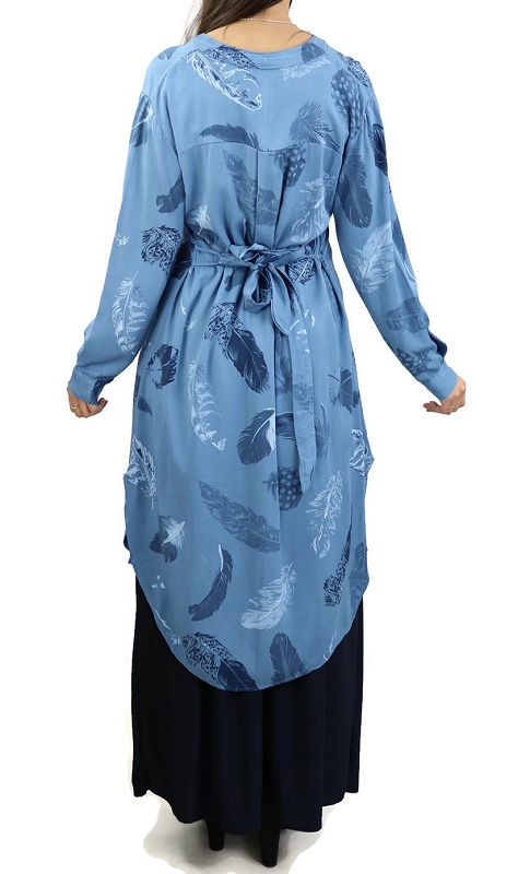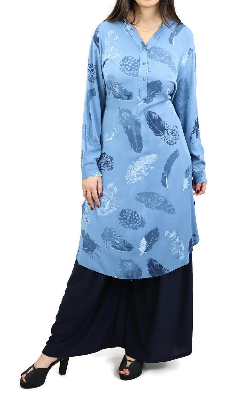 Sa coupe droite, ses manches longues, ses couleurs composées de nuances de bleu et ses motifs singuliers font d'elle un incontournable à posséder.