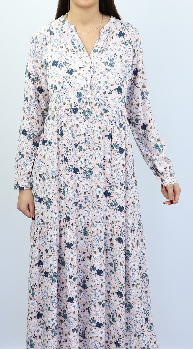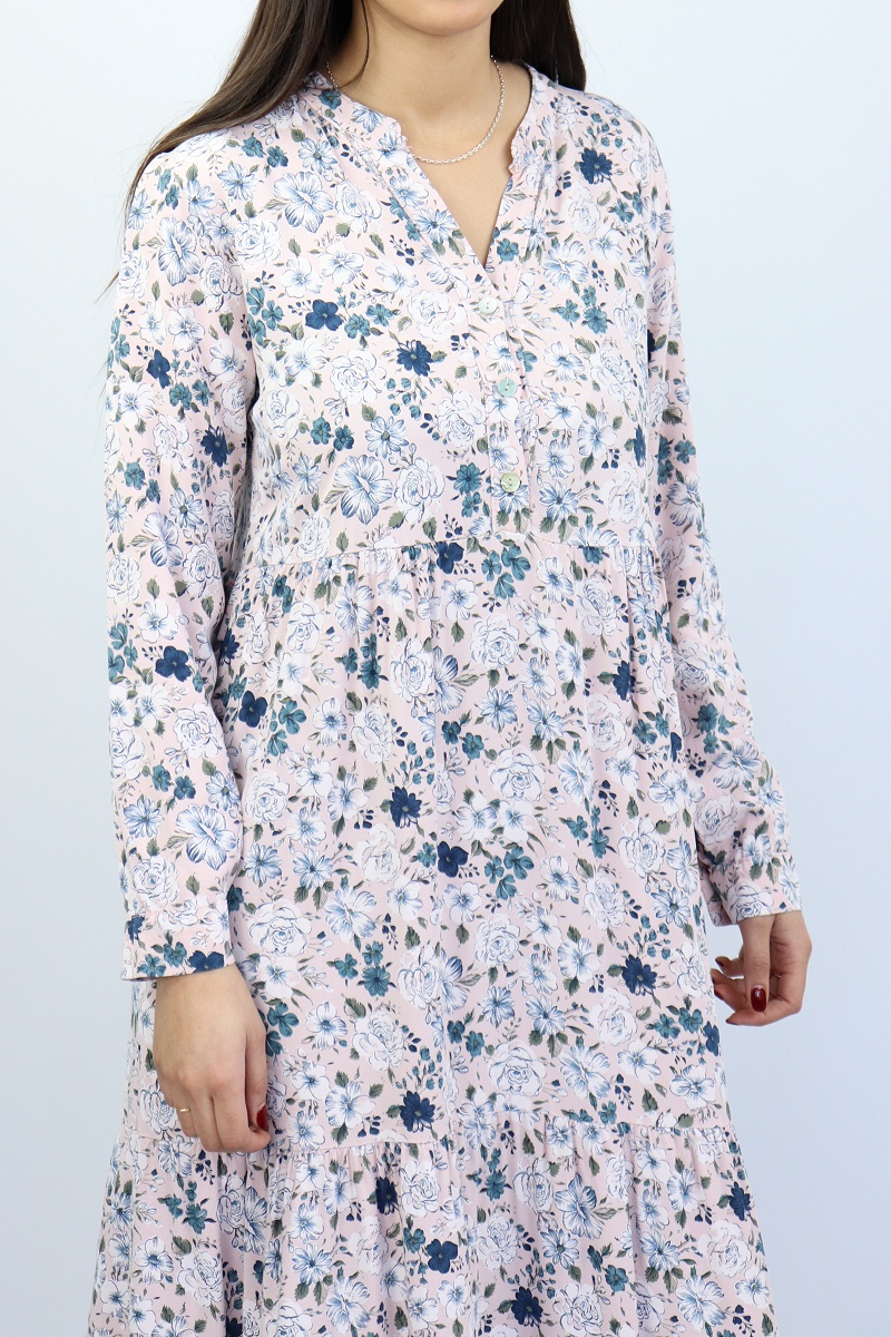Robe rose pale avec motifs fleurs variés.
