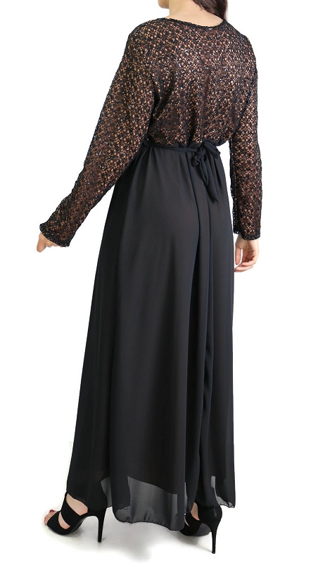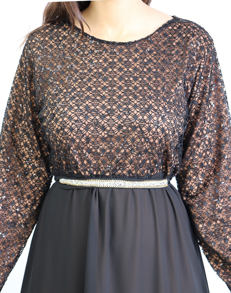 Robe longue évasée de couleur Noire, pailletée sur la partie haute? entièrement doublée (de couleur marron). La partie basse est faite en mousseline. Livrée avec sa ceinture assortie décorée de strass argentés et de chaines dorées.