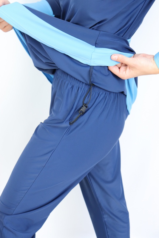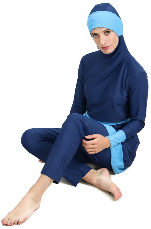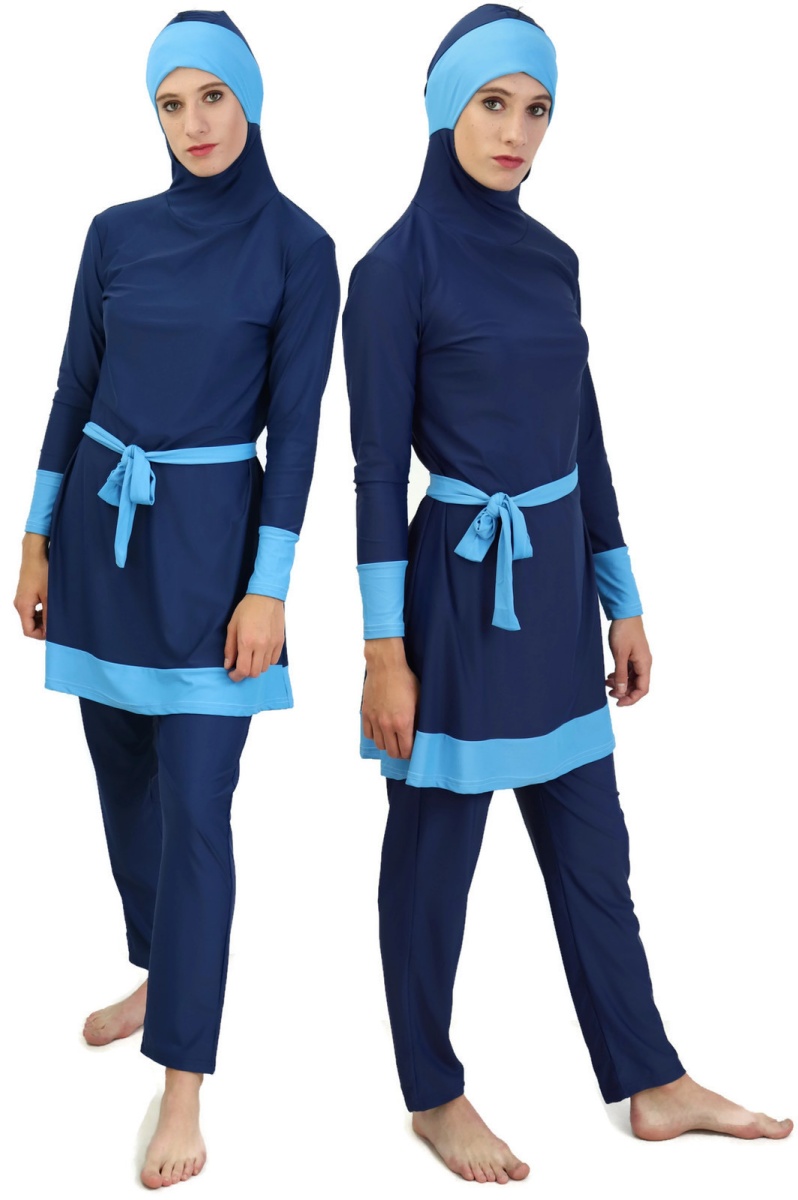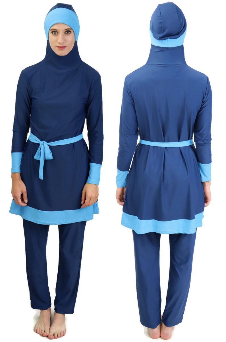 Burkini de couleur bleu marine et bleu ciel constitué d'une tunique et de son pantalon avec une ceinture bleue ciel assortie. Le pantalon peut s'attacher (se clipser) à la tunique des deux côtés (voir photo).