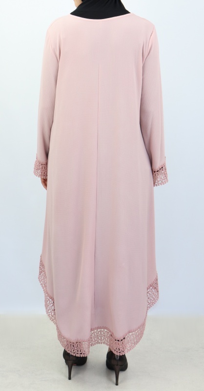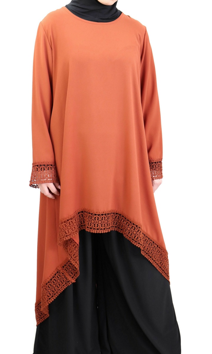 Tunique ample et évasée, tissu léger de type crêpe, coupe un peu plus longue à l'arrière et pour finir dentelle sur les poignets et le bas.