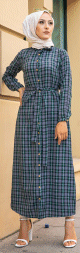 Robe boutonnée écossaise longue avec ceinture assortie pour femme (Vetement Modest Fashion) - Carreaux verts - REF. 34582 (25.00 €)