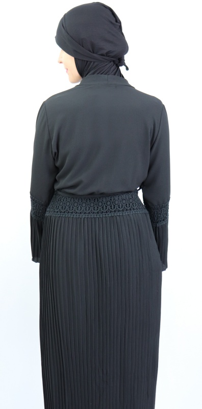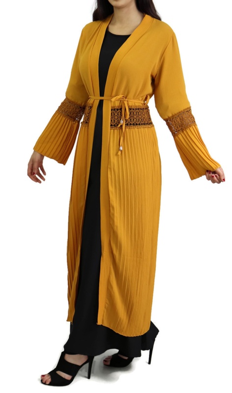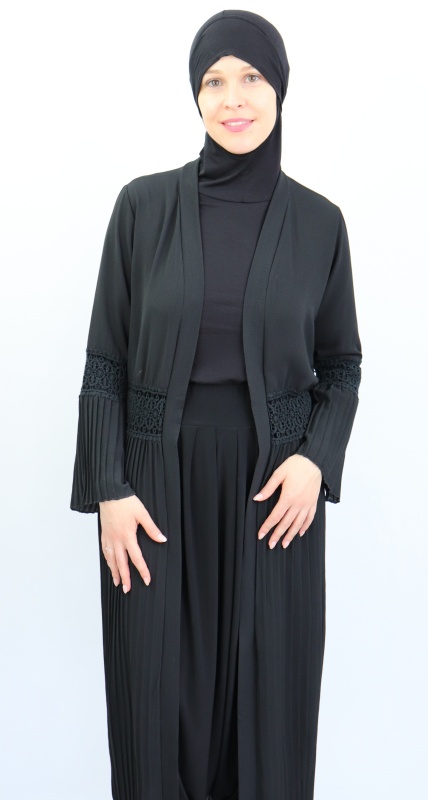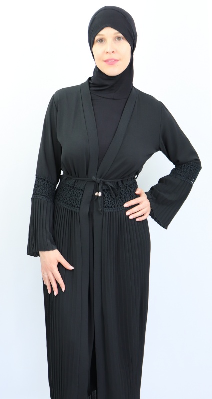 Remarquez l'originalité de la couleur de ce gilet avec parties brodées (dentelle au niveau du ventre et des coudes) et parties plissés. Il se met aussi bien avec une robe (d'une couleur différente pour avoir un effet comme sur les photos) qu'avec une jupe longue ou courte, un pantalon ou une tunique. En effet, sa coupe plissée ample fait qu'il vous couvrira de la tête aux pieds.