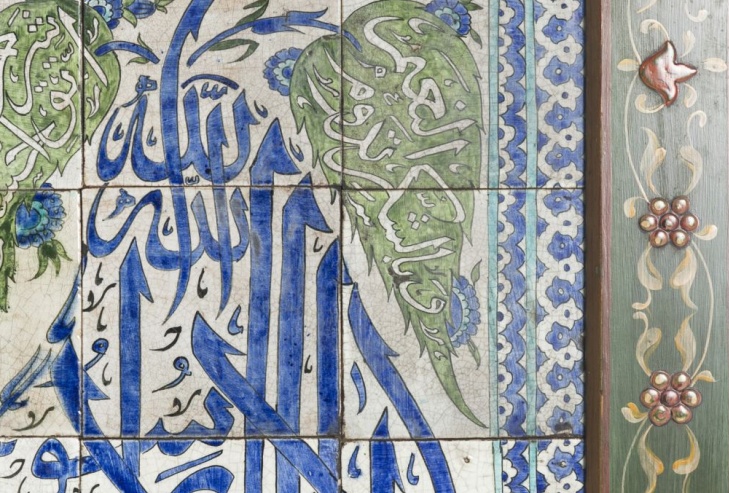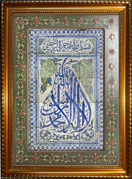Tableau représentatif de l'art islamique... Les arts de l'Islam dans le monde musulman (de l'Espagne jusqu'à l'Inde et habité par des populations de culture islamique diverses). On y lit en haut la formule de la basmala et en dessous la calligraphie artistique de l'attestation de foi (la chaha)...