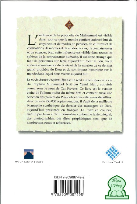 L'influence de la prophétie de Muhammad est visible dans tout ce que le monde contient aujourd'hui de croyances et de modes de pensées, de cultures et de civilisations, de morales et de modes de vies, connaissances et de sciences, bref, cette influence est visible dans toutes les sphères de la connaissance humaine. Il est donc étrange que tant de personnes sur terre aient si peu, voire aucune connaissance de la vie et de la mission de ce dernier grand prophète de Dieu et de son impact historique sur le monde dans lequel nous vivons aujourd'hui. La vie du dernier Prophète (BSL) est un récit authentique de la vie du Prophète Muhammad écrit par Yusuf Islam, autrefois connu sous le nom de Cat Stevens. Ce livre est la version écrite de l'album audio du même titre et contient aussi une sélection de paroles du Prophète et des références détaillées. Avec plus de 250 000 copies vendues, il s'agit de la meilleure biographie synthétique du dernier messagers de Dieu, aujourd'hui présentées en français. Le livre en couleur, traduit pas Iman et Tariq Ramadan, contient le texte intégral, des photographies, des dires prophétiques ainsi que de nombreuses notes et références.
