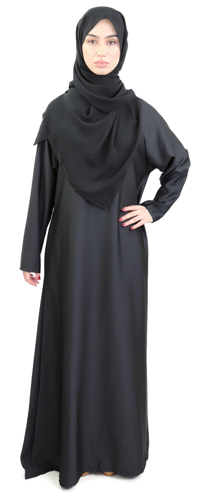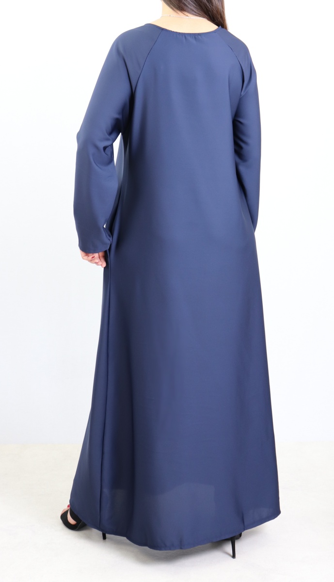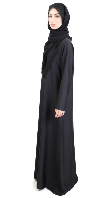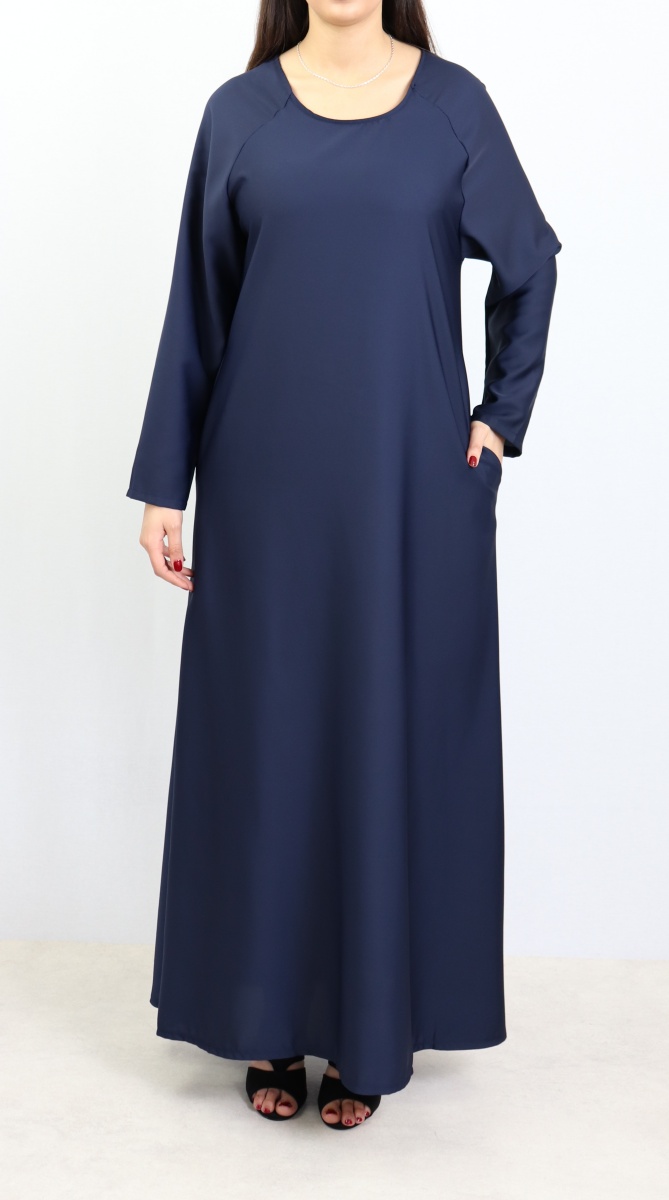 Robe évasée couleur noire, avec deux poches latérales, tissu fluide et léger, légèrement élastique.