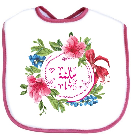 Bavoir pour bébé avec prénom personnalisé en arabe et/ou français inscrit au milieu d'une peinture aquarelle de fleurs. Excellente idée cadeau pour une naissance.