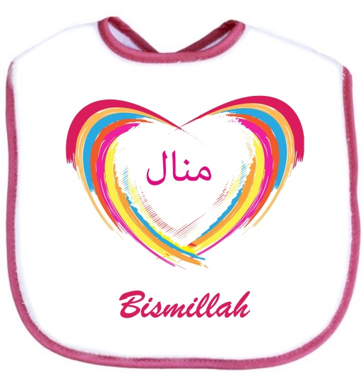 Bavoir pour bébé avec prénom personnalisé en arabe et/ou français inscrit au milieu d'un coeur multi-couleurs. Excellente idée cadeau pour une naissance.