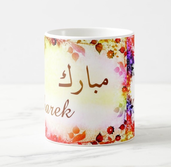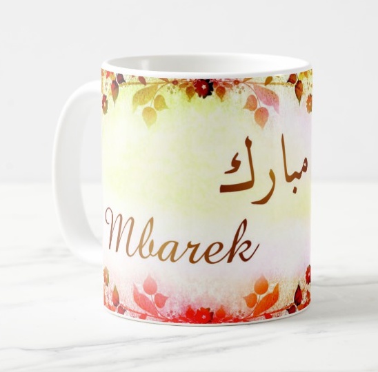 Mug avec le prénom Mbarek calligraphié en arabe ainsi que son écriture normale en arabe (مبارك) et en français.