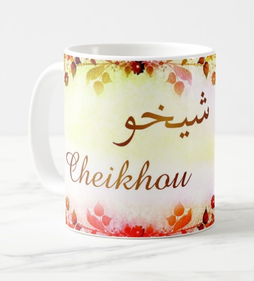 Mug avec le prénom Cheikhou calligraphié en arabe ainsi que son écriture normale en arabe (شيخو) et en français.