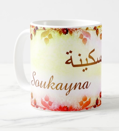 Mug avec le prénom Soukayna calligraphié en arabe ainsi que son écriture normale en arabe (سكينة) et en français.