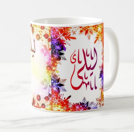 Mug avec le prénom Leïla calligraphié en arabe ainsi que son écriture normale en arabe (ليلى) et en français.