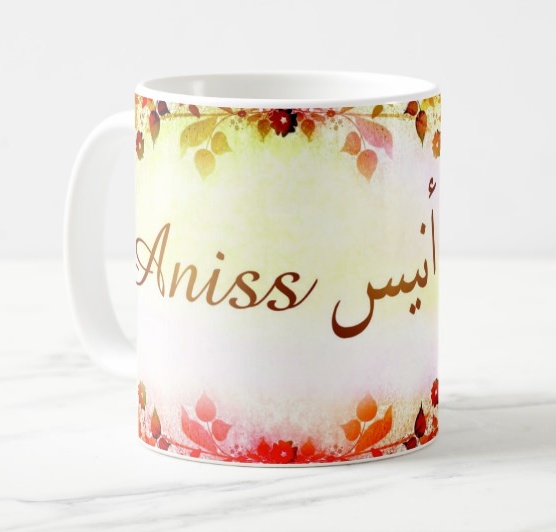 Mug avec le prénom Aniss calligraphié en arabe ainsi que son écriture normale en arabe (أنيس) et en français.