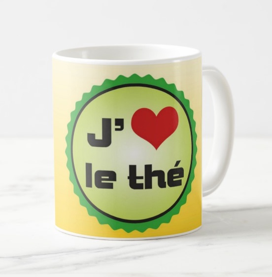 Mug avec l'inscription en français J'aime le thé et en anglais (I love tea) pour les amoureux du thé.