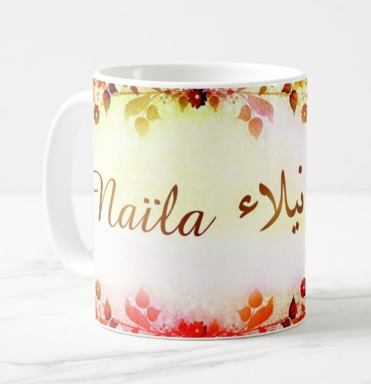 Mug avec le prénom Naïla calligraphié en arabe ainsi que son écriture normale en arabe (نيلاء) et en français.