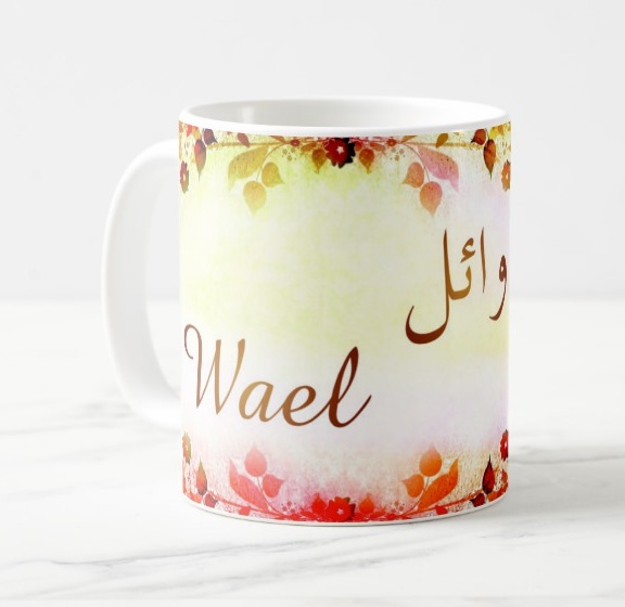 Mug avec le prénom Wael calligraphié en arabe ainsi que son écriture normale en arabe (وائل) et en français.