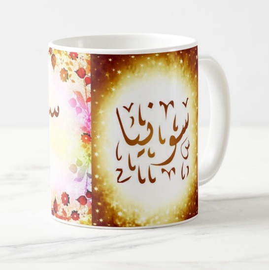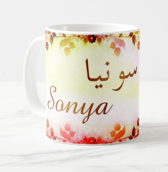 Mug avec le prénom Sonya calligraphié en arabe ainsi que son écriture normale en arabe (سونيا) et en français.