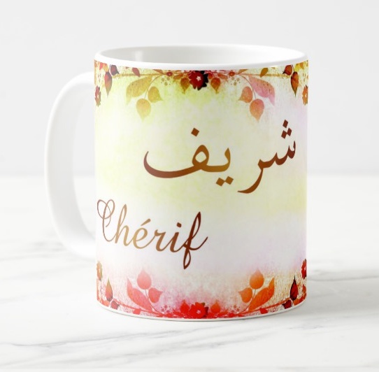 Mug avec le prénom Chérif calligraphié en arabe ainsi que son écriture normale en arabe (شريف) et en français.