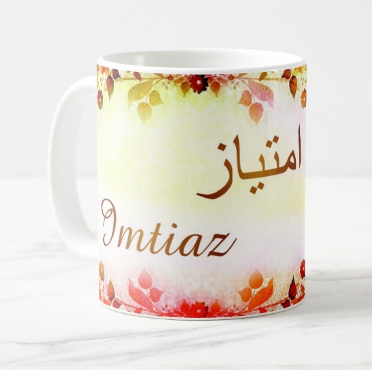 Mug avec le prénom Imtiaz calligraphié en arabe ainsi que son écriture normale en arabe (امتياز) et en français.