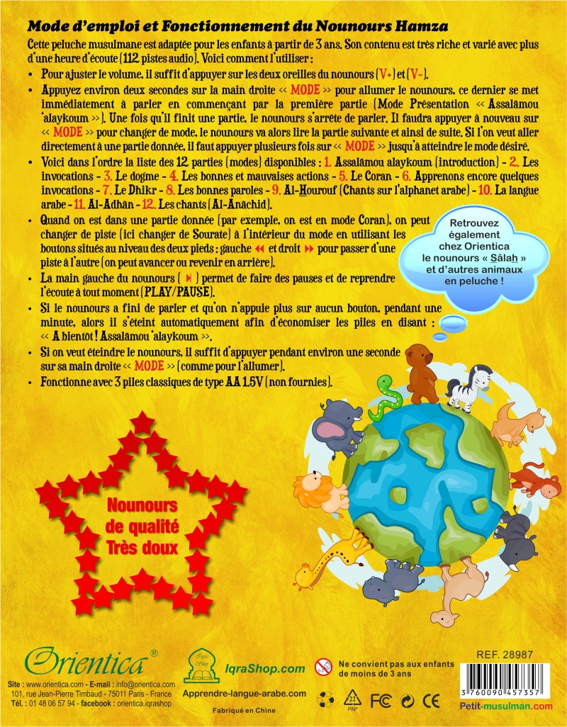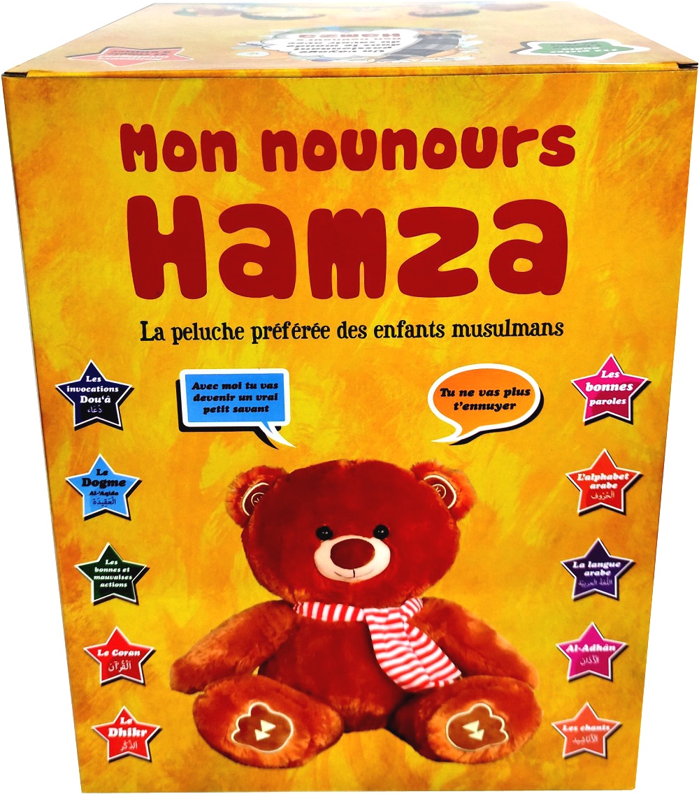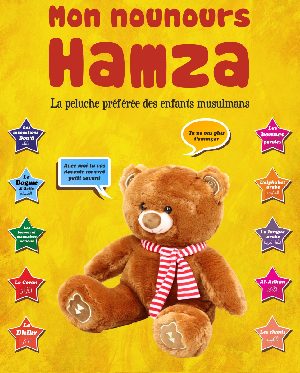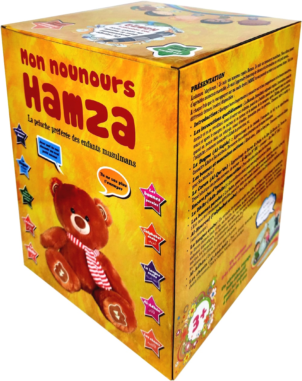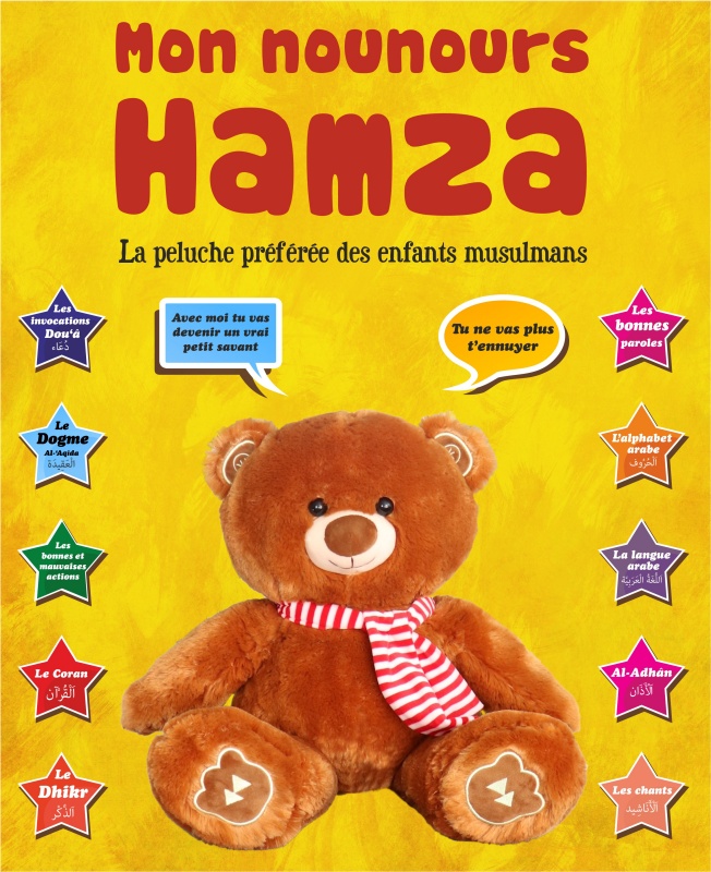 Asslamou ‘alaykoum ! Je suis ton nouveau copain Hamza. Je suis un nounours musulman. Nous allons passer d’agréables moments ensemble. Je vais t’apprendre beaucoup de choses et tu deviendras un vrai petit savant...