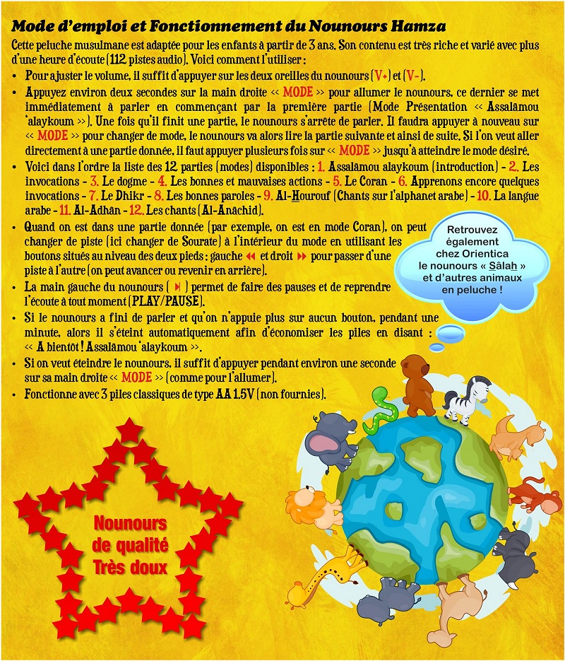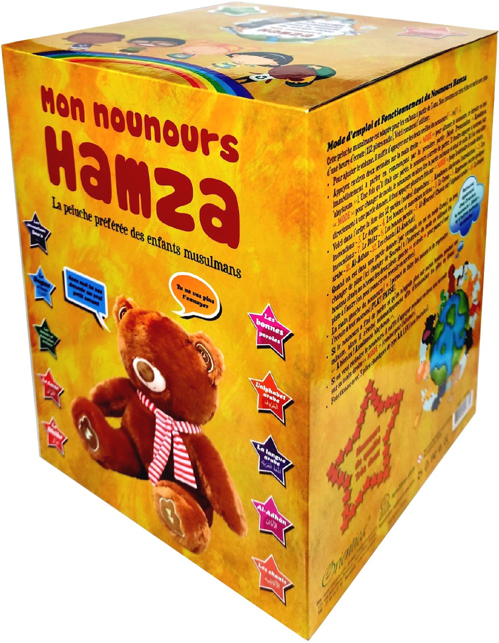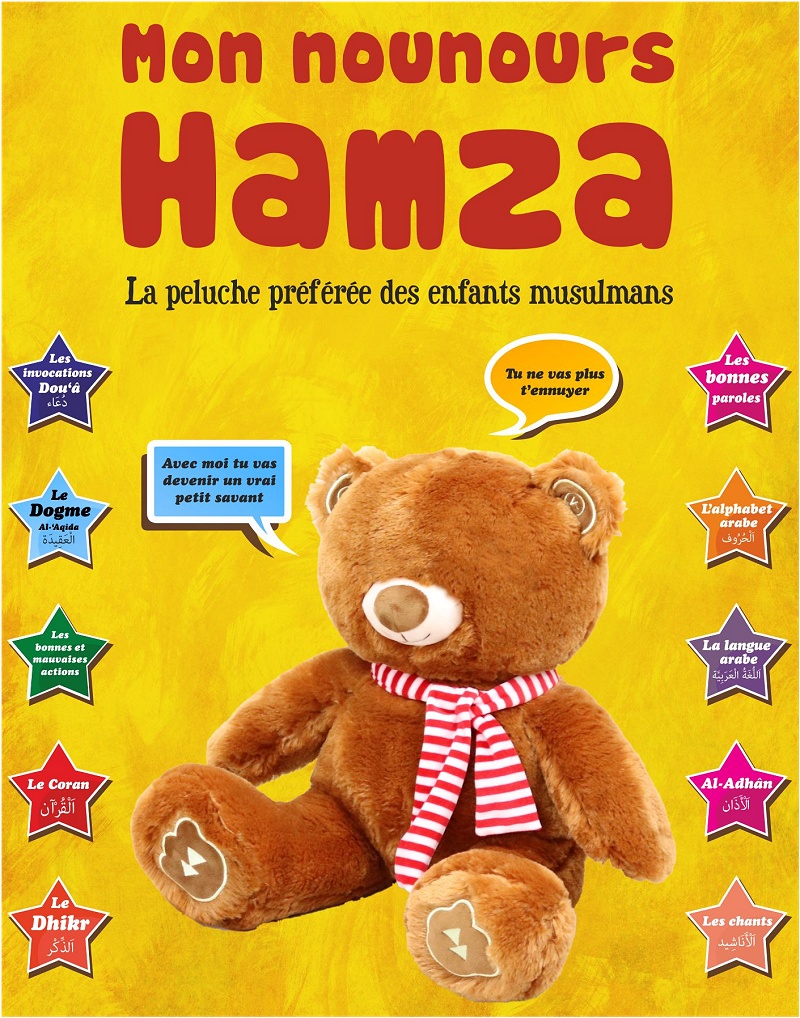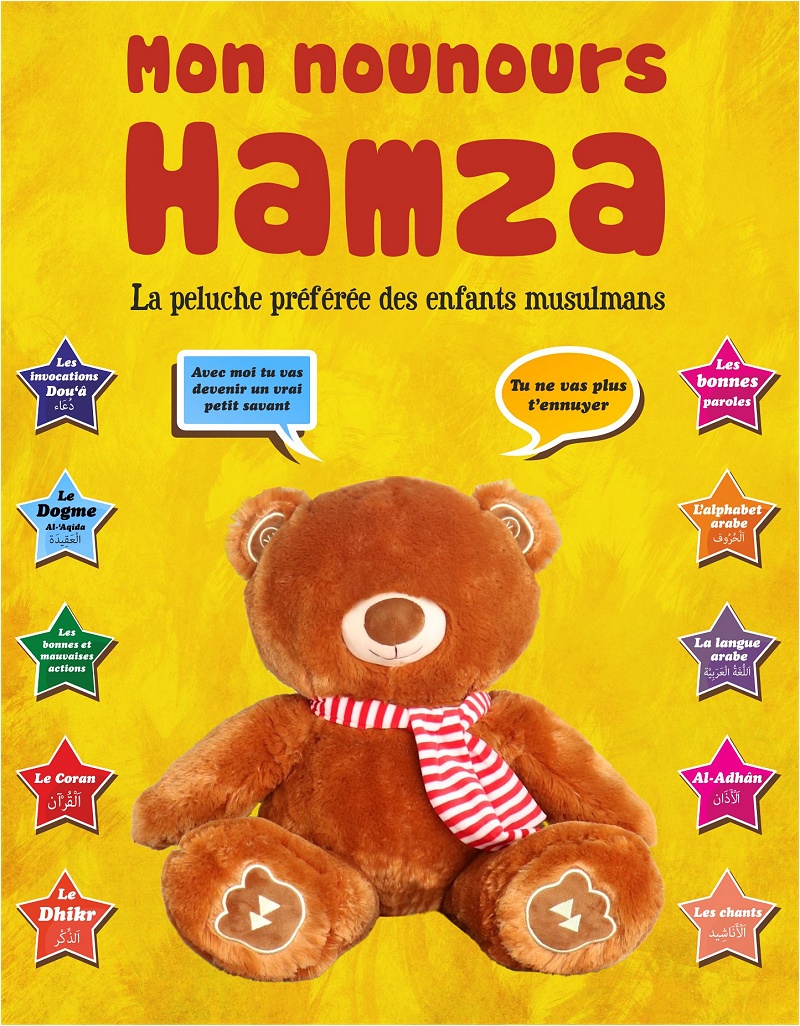 Asslamou ‘alaykoum ! Je suis ton nouveau copain Hamza. Je suis un nounours musulman. Nous allons passer d’agréables moments ensemble. Je vais t’apprendre beaucoup de choses et tu deviendras un vrai petit savant...
