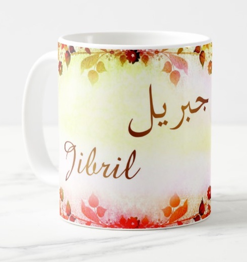 Mug avec le prénom Jibril calligraphié en arabe ainsi que son écriture normale en arabe (جبريل) et en français.