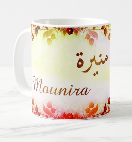 Mug avec le prénom Mounira calligraphié en arabe ainsi que son écriture normale en arabe (منيرة) et en français.