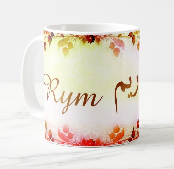 Mug avec le prénom Rym calligraphié en arabe ainsi que son écriture normale en arabe (ريم) et en français.