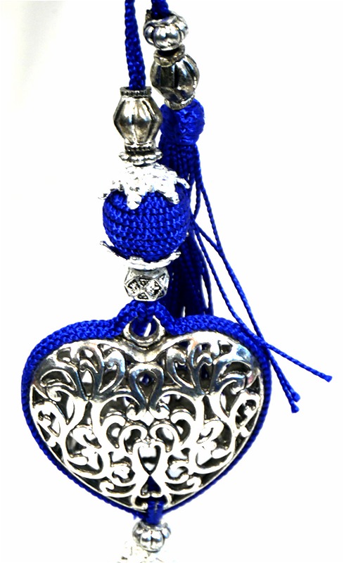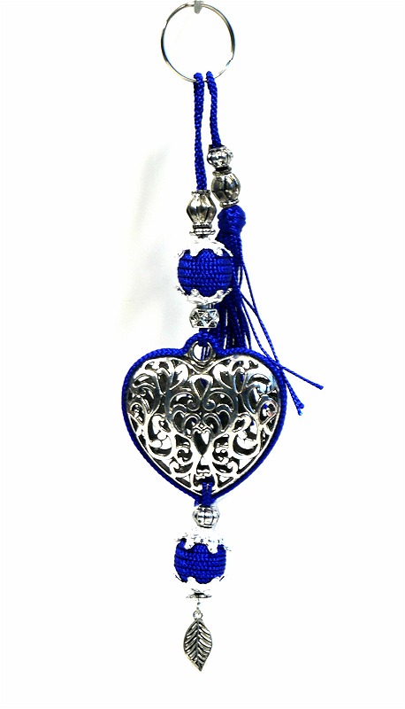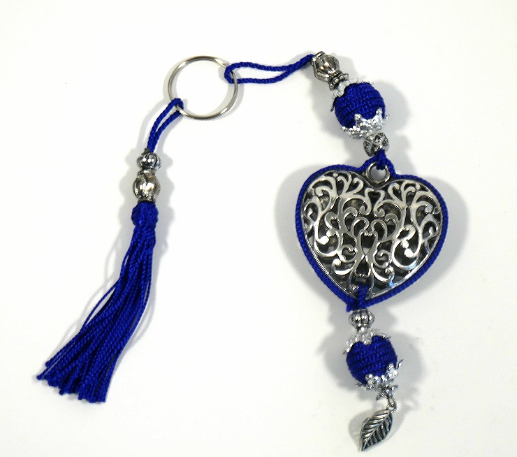 Porte-clés artisanal coeur en métal argenté ciselé et pompon en sabra - Bleu roi - REF. 29008 (5.90 €)