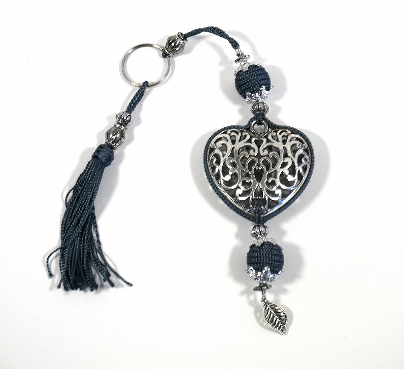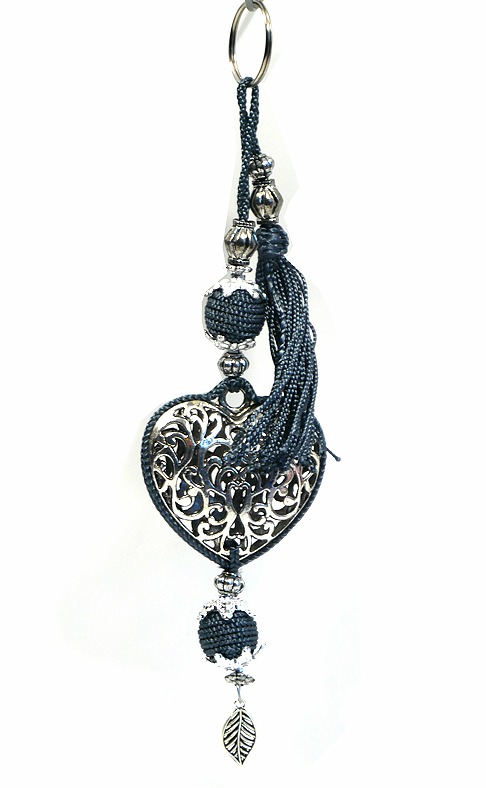 Porte-clés en métal argenté joliment ciselé, constitués de breloques, grand coeur, et de pompon en sabra, avec 8 coloris disponibles... De jolis agréments argentés font de ces porte-clés des pièces originales.