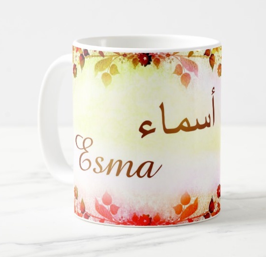 Mug avec le prénom Esma calligraphié en arabe ainsi que son écriture normale en arabe (أسماء) et en français.