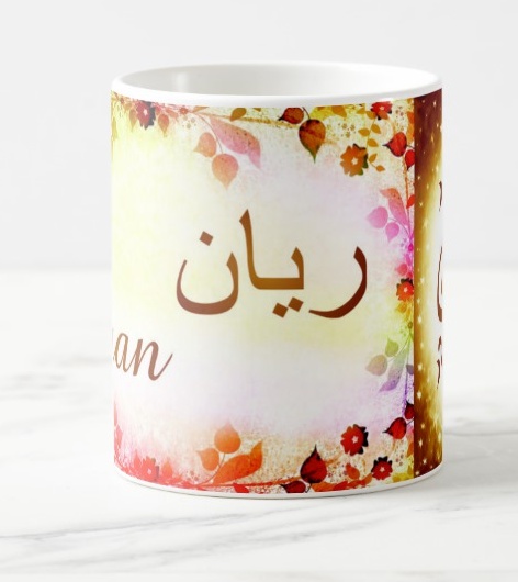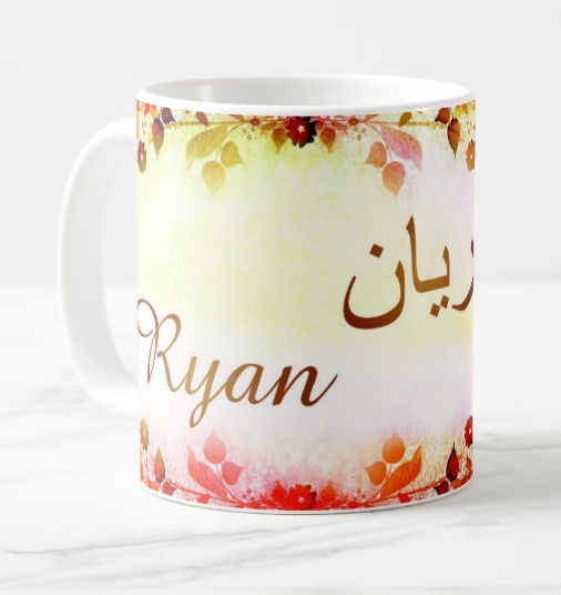 Mug avec le prénom Ryan calligraphié en arabe ainsi que son écriture normale en arabe (ريان) et en français.