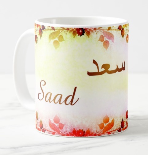Mug avec le prénom Saad calligraphié en arabe ainsi que son écriture normale en arabe (سعد) et en français.