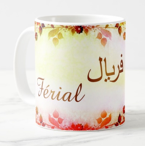 Mug avec le prénom Férial calligraphié en arabe ainsi que son écriture normale en arabe (فريال) et en français.