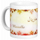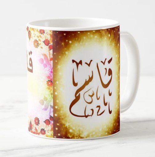 Mug avec le prénom Quacime calligraphié en arabe ainsi que son écriture normale en arabe (قاسم) et en français.