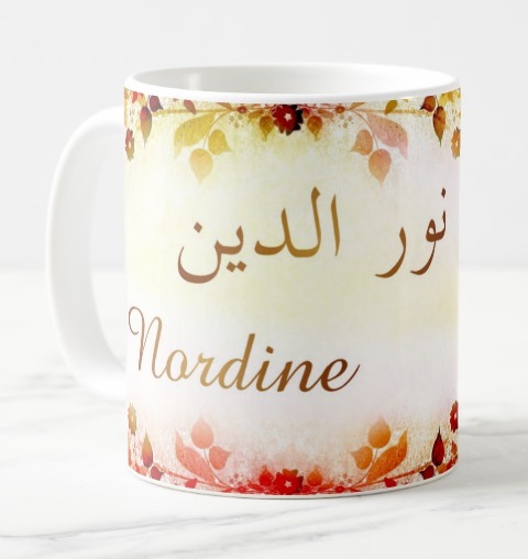 Mug avec le prénom Nordine calligraphié en arabe ainsi que son écriture normale en arabe (نور الدين) et en français.