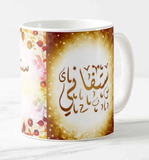 Mug avec le prénom Stephanie calligraphié en arabe ainsi que son écriture normale en arabe (ستفاني) et en français.
