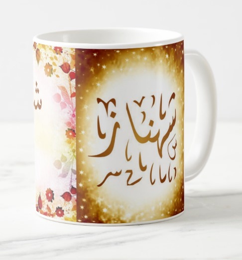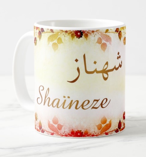 Mug avec le prénom Shaïneze calligraphié en arabe ainsi que son écriture normale en arabe (شهناز) et en français.