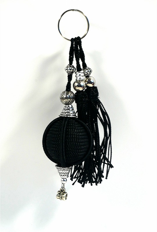 Pendentif / Porte-clés tout en sobriété, fait à la main par un artisan. Il arbore des pompons et une couleur noir charbon. Idéal pour regrouper clé de la maison, clé de la voiture, clé de coffre-fort et autres clés importantes qui peuvent vite vous mettre dans une situation embarrassante si vous n'arrivez plus à les retrouver.