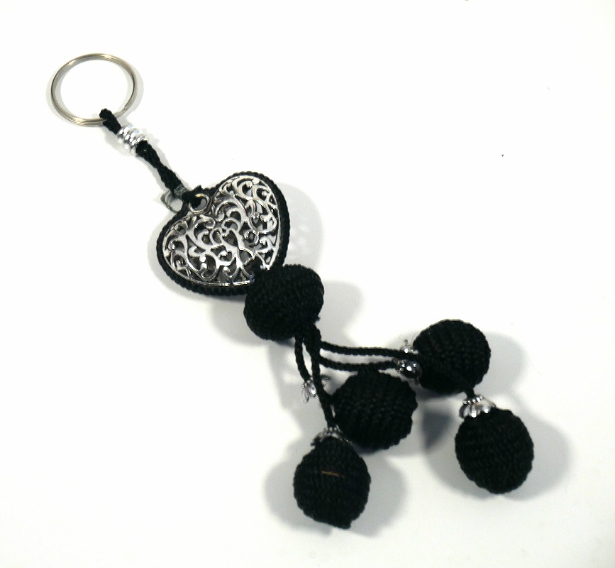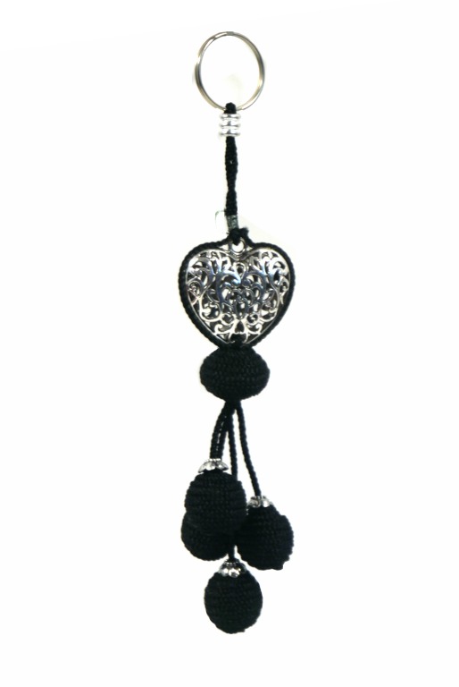 Pendentif / Porte-clés artisanal coeur en métal argenté ciselé et pompon en sabra - Noir - REF. 29099 (6.90 €)