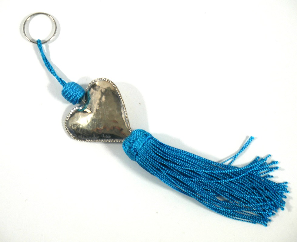 Porte-clés artisanal coeur en métal argenté ciselé et pompon en sabra - Bleu ciel Deco & Cadeau