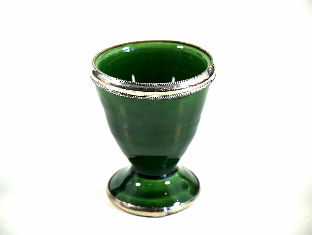 Coquetier artisanal en poterie, en provenance de Marrakech (Maroc), peint en vert foncé, émaillé, et cerclé de métal ornemental argenté, légèrement ciselé.
